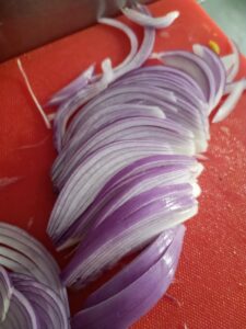 Peel and slice the onions evenly to ensure they cook at the same rate, as shown in the picture