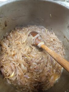 Reduce the heat to medium-low, cook the onions slowly, stirring every 5 to 10 minutes, during the first 10-15 minutes, the onions will begin to soften and release moisture, as time goes on, they’ll gradually turn golden and then deep brown.